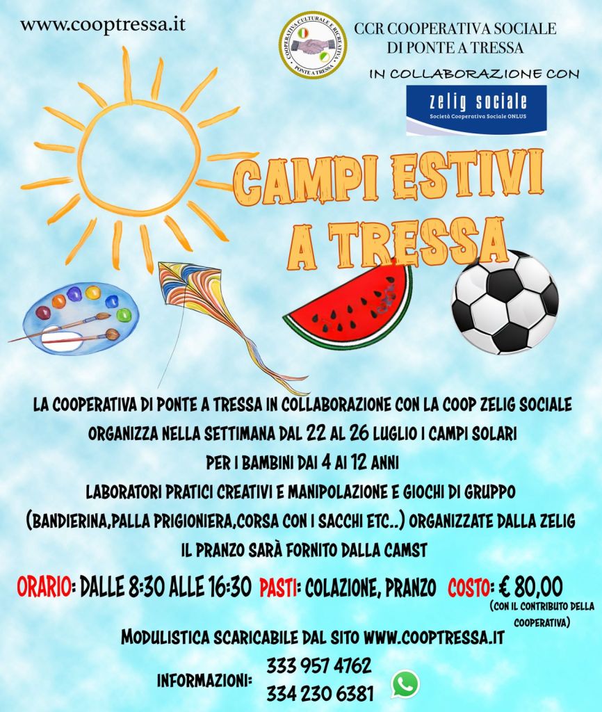 La Cooperativa di Ponte a Tressa in collaborazione con la Coop Zelig Sociale organizza nella settimana dal 22 al 26 luglio i campi solari per i bambini dai 4 ai 12 anni con laboratori e giochi creativi e divertenti organizzati dalla Coop Zelig Sociale.