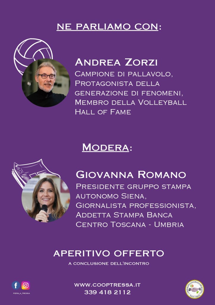 Termina il ciclo di appuntamenti con i Tressa ci Porta di questo anno 2024 con un’analisi critica e attenta a proposito dello sport nella società moderna da parte del campione di pallavolo Andrea Zorzi. Ad intervistarlo, la giornalista Giovanna Romano.